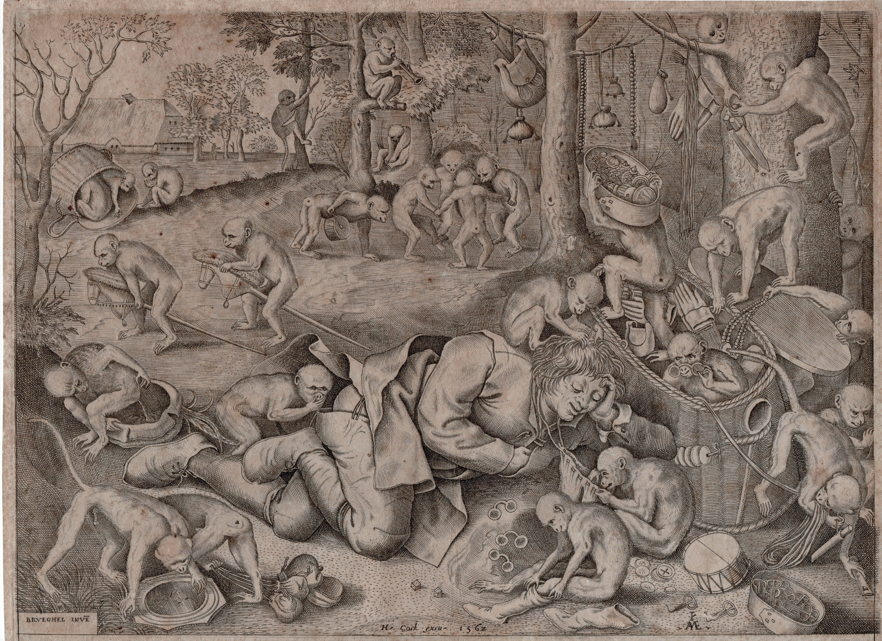 The Sleeping Pedlar Robbed by Monkeys is a traditional folk motive, to which Bruegel gives a delightful vividness. This print is often compared to an anonymous German woodcut from the end of the 15th century, with a similar composition, but a rougher execution. The print by Pieter van der Heyden was itself widely circulated and copied many times.