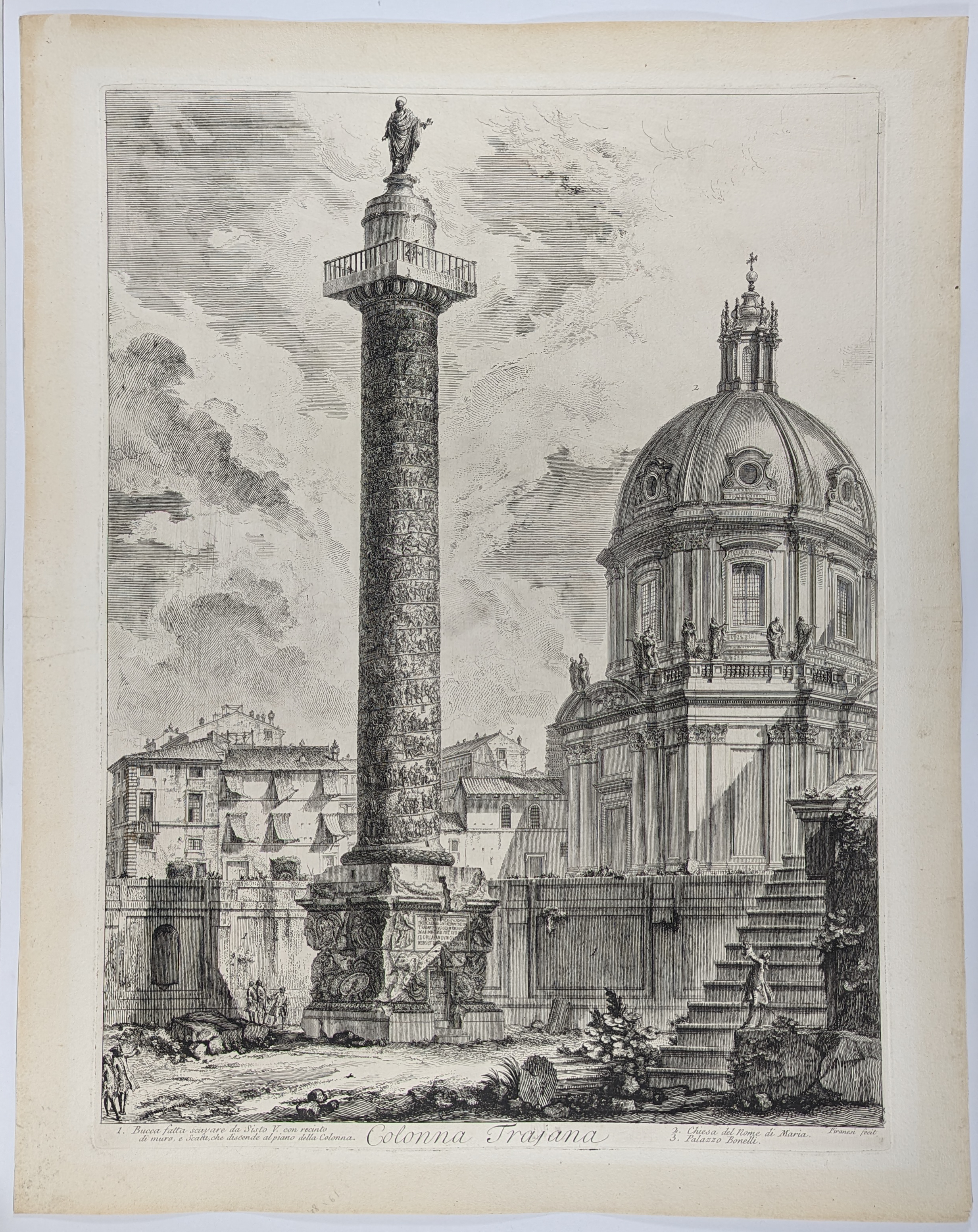Impressions of the second state bear Bouchard and Gravier’s address. Giovanni Bouchard, or rather Jean Bouchard as he was from France, arrived in Rome in the early 1740s. From 1753 onwards, he was associated with one of his compatriots, Joseph Gravier. By the time he etched the Colonna Trajana, Piranesi had already been publishing prints with Bouchard for some time: his name appears (spelt Giovani Buzard) in the 1749/1750 edition of the Carceri. We can assume that the impressions of the first state were trial proofs printed by Piranesi before the edition (also rare) by Bouchard and Gravier.