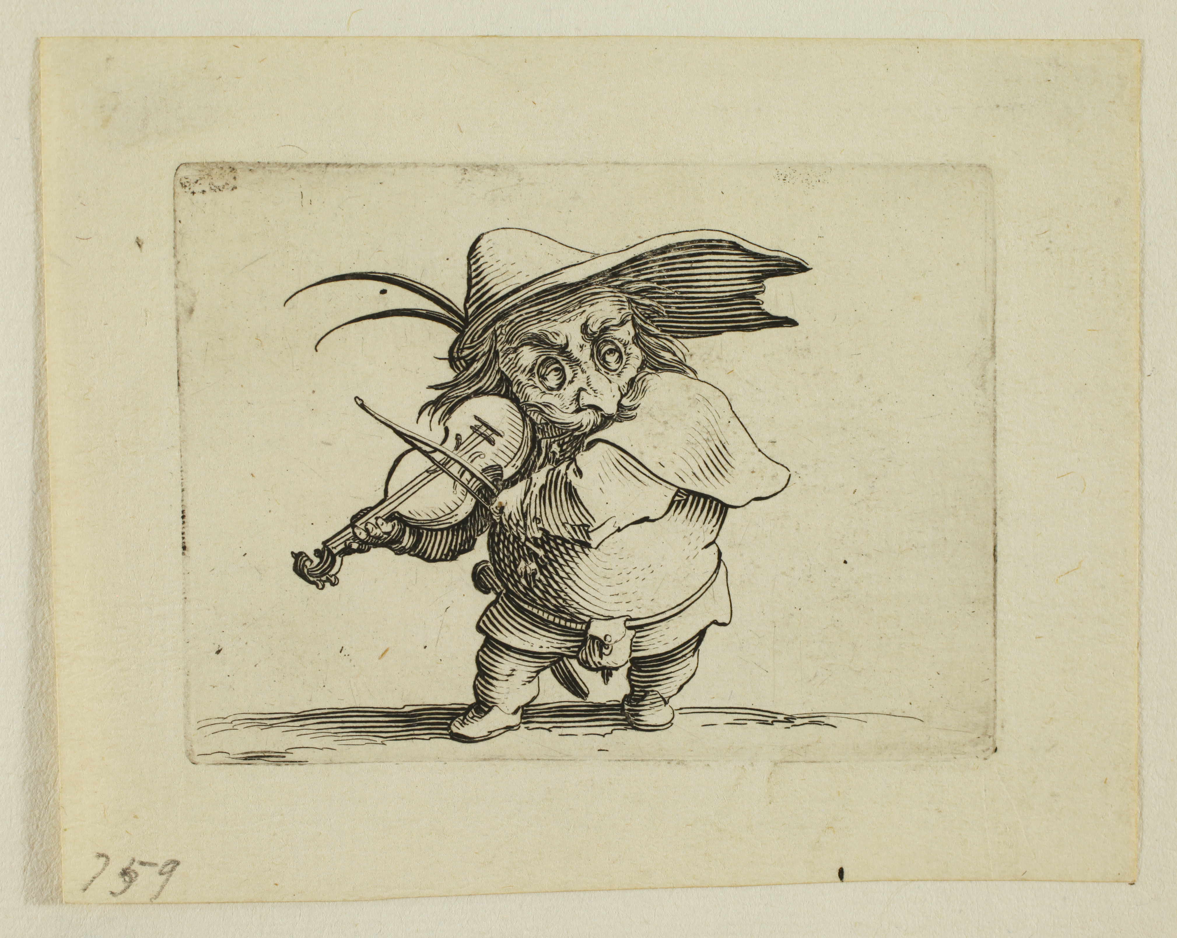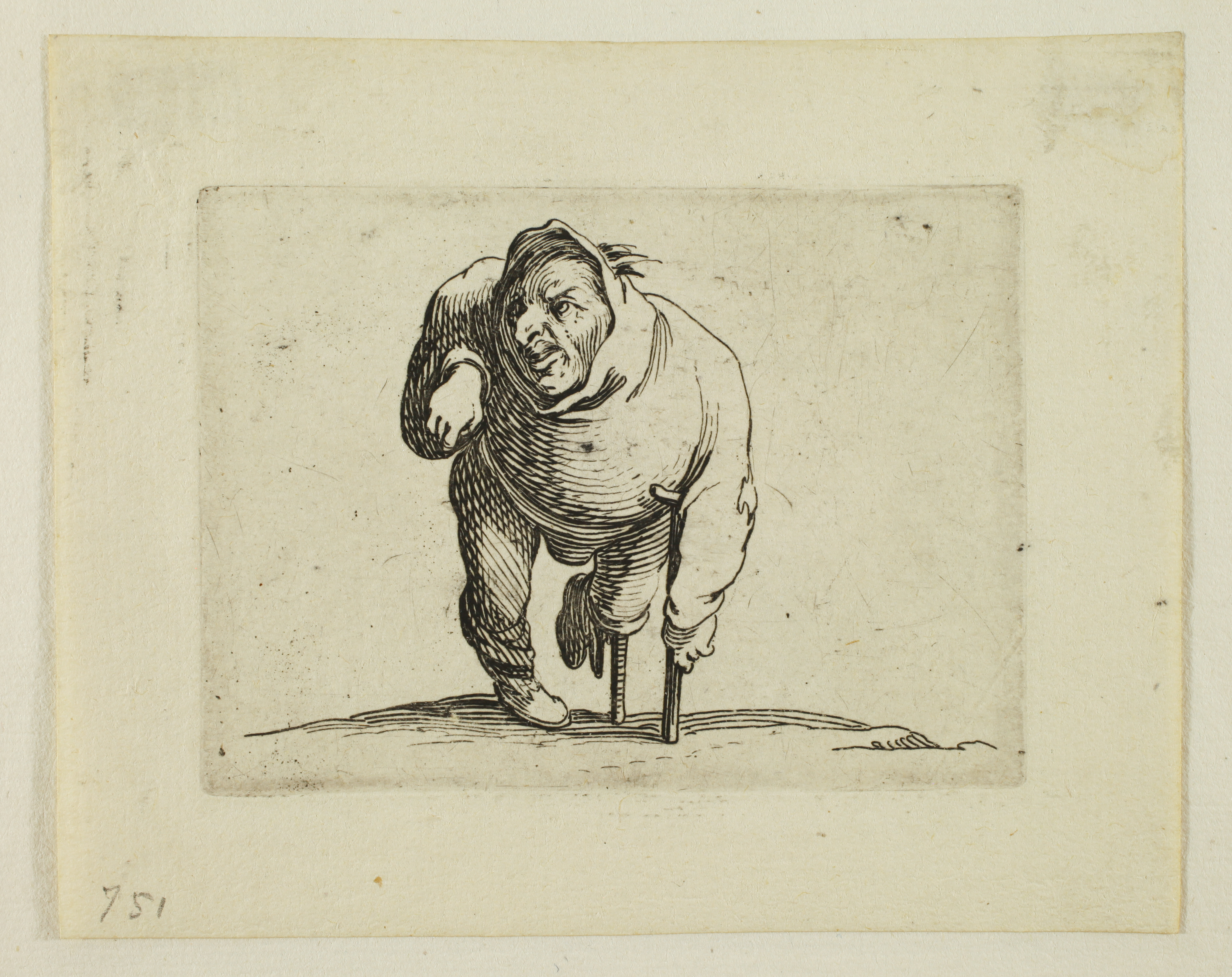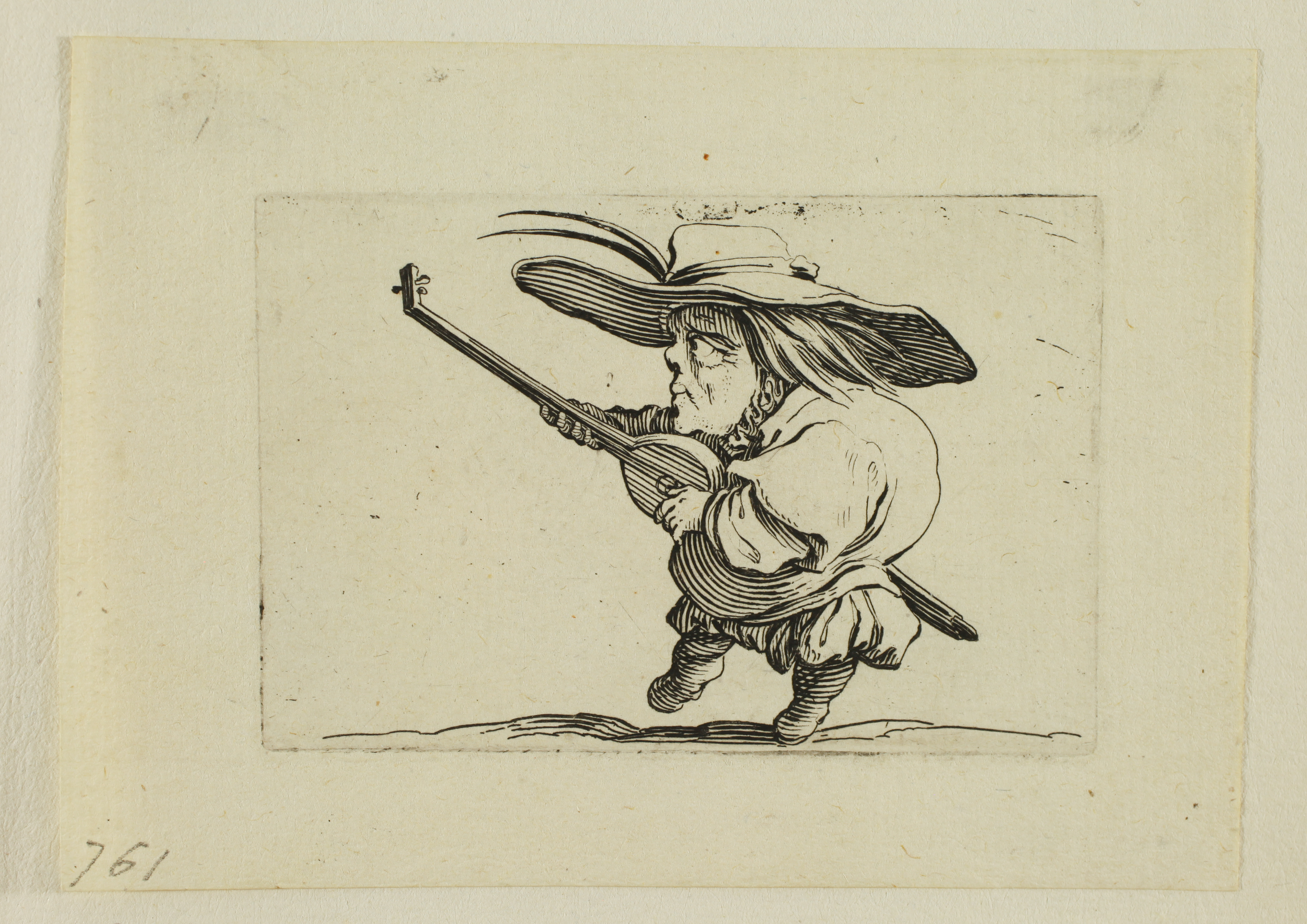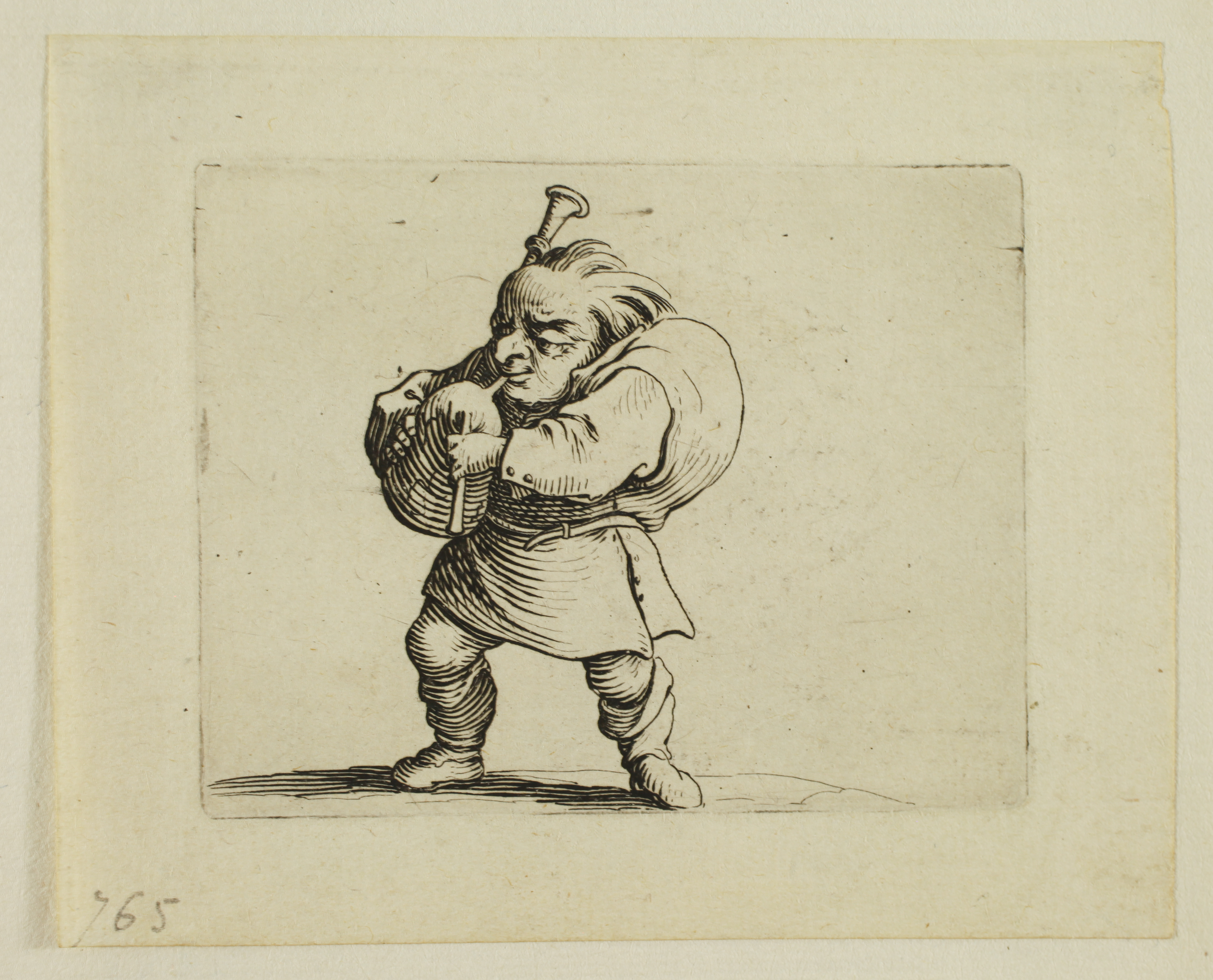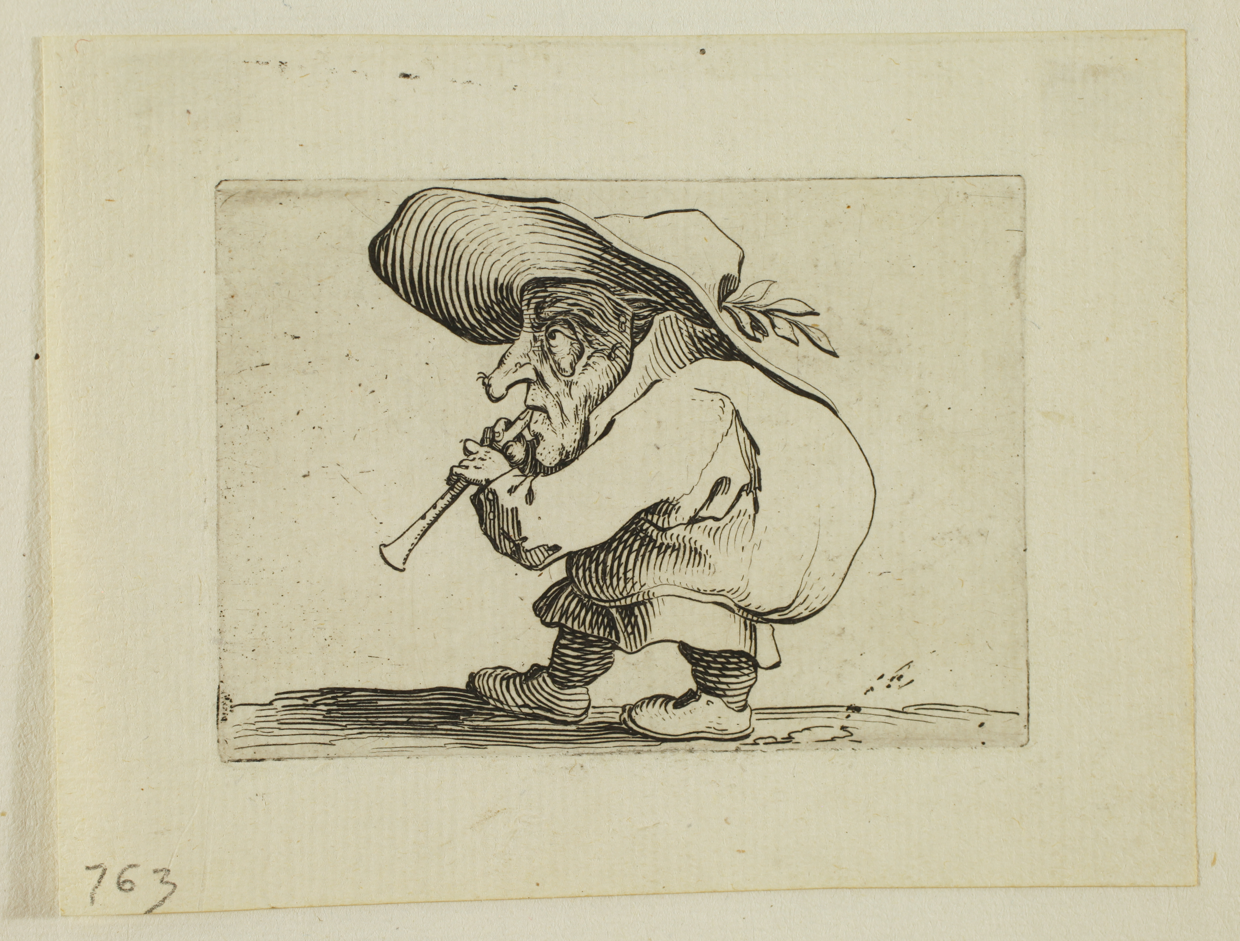 Frontispice : Lieure 279, 1er état/2 avant l’adresse d’Israël Silvestre ; L’Homme s’apprêtant à tirer son sabre : L. 407, état unique ; L’Estropié au capuchon : L. 408, 1er état/2 avant la numérotation ; Le Bossu à la canne : L. 409, 1er état/2 avant la numérotation ; L’Estropié à la béquille et à la jambe de bois : L. 410, 1er état/2 avant la numérotation ; Le Buveur vu de face : L. 411 , 1er état/2 avant la numérotation ; Le Buveur vu de dos : L. 412, 1er état/3 avant que le terrain à gauche soit effacé sur un espace d’un centimètre et avant la numérotation ; Le Duelliste aux deux sabres : L. 413, 1er état/2 avant la numérotation ; Le Duelliste à l’épée et au poignard : L. 414 , 1er état/2 avant la numérotation ; L’Homme au gros ventre orné d’une rangée de boutons : L. 415, 1er état/2 avant la numérotation ; L’Homme au gros dos orné d’une rangée de boutons : L. 416, 1er état/2 avant la numérotation ; L’Homme au ventre tombant et au chapeau très élevé : L. 417, 1er état/2 avant la numérotation ; Le Joueur de violon : L. 418 , 1er état/2 avant la numérotation ; L’Homme masqué aux jambes torses : L. 419, 1er état/2 avant la numérotation ; Le Joueur de luth : L. 420, 1er état/2 avant la numérotation ; Le Joueur de vielle : L. 421, 1er état/2 avant la numérotation ; Le Joueur de flageolet : L. 422, 1er état/2 avant la numérotation ; L’Homme raclant un gril en guise de violon : L. 423 , 1er état/2 avant la numérotation ; Le Joueur de cornemuse : L. 424, 1er état/2 avant la numérotation ; Le Comédien masqué jouant de la guitare : L. 425, 1er état/2 avant la numérotation ; Le Bancal jouant de la guitare : L. 426, 1er état/2 avant la numérotation.