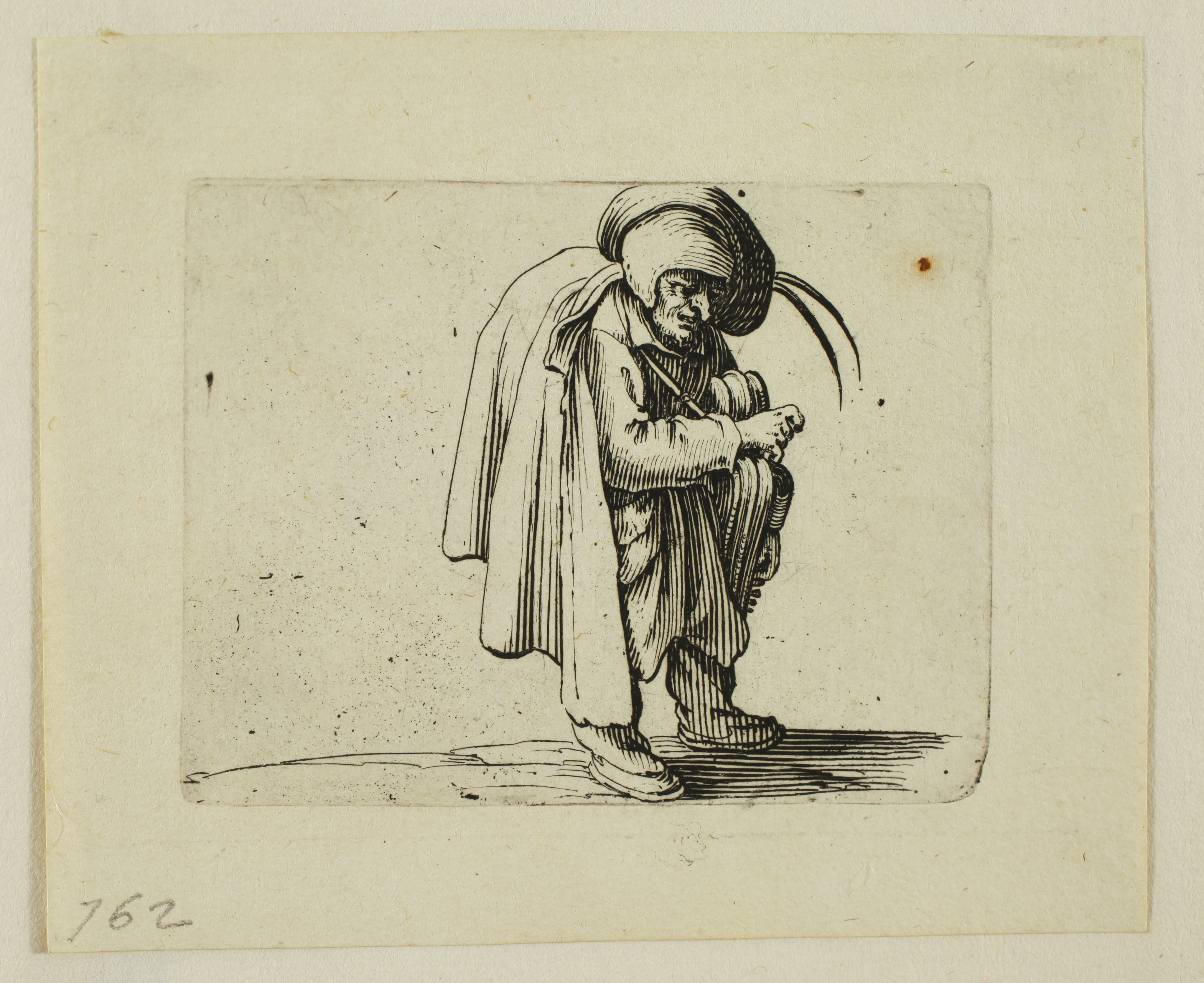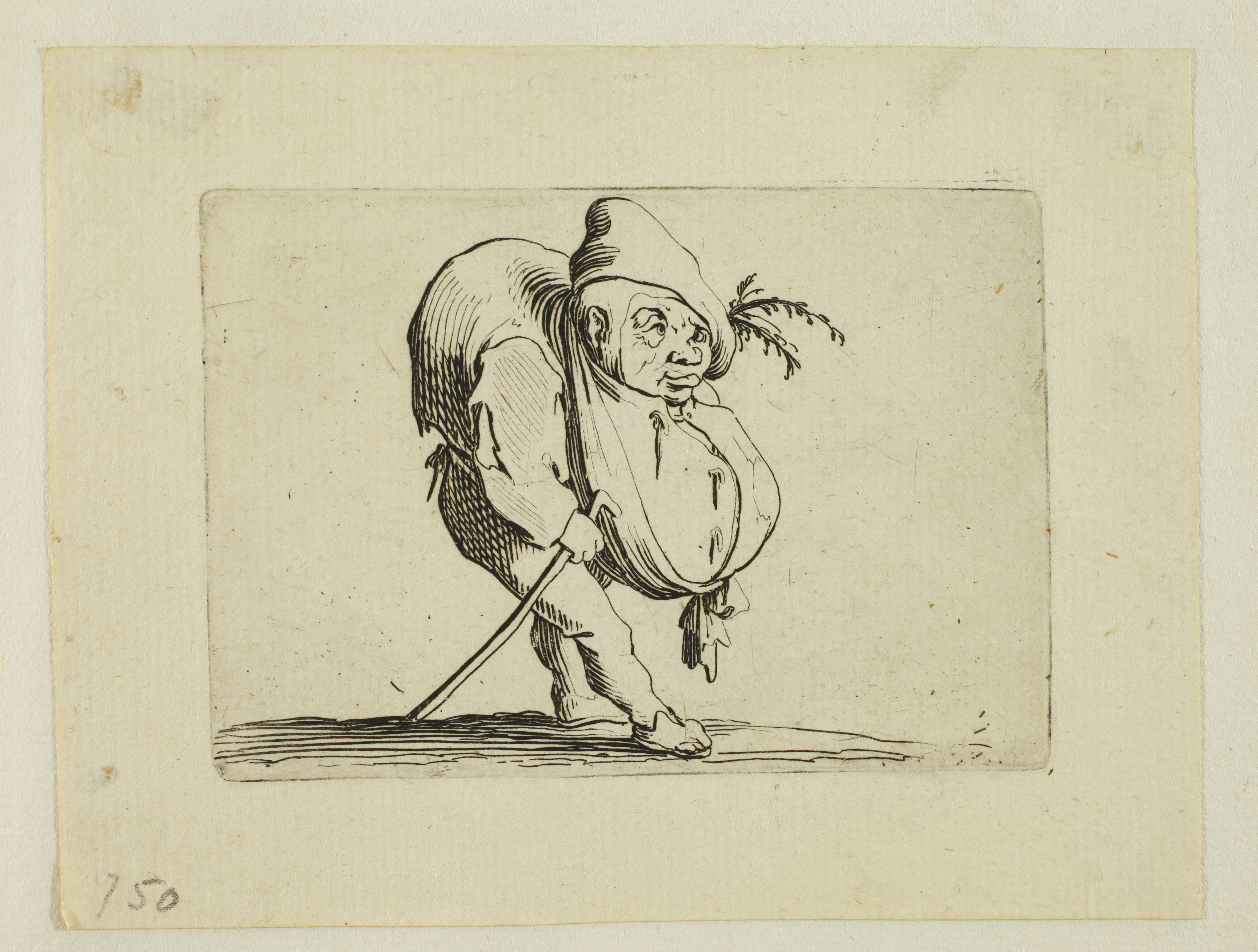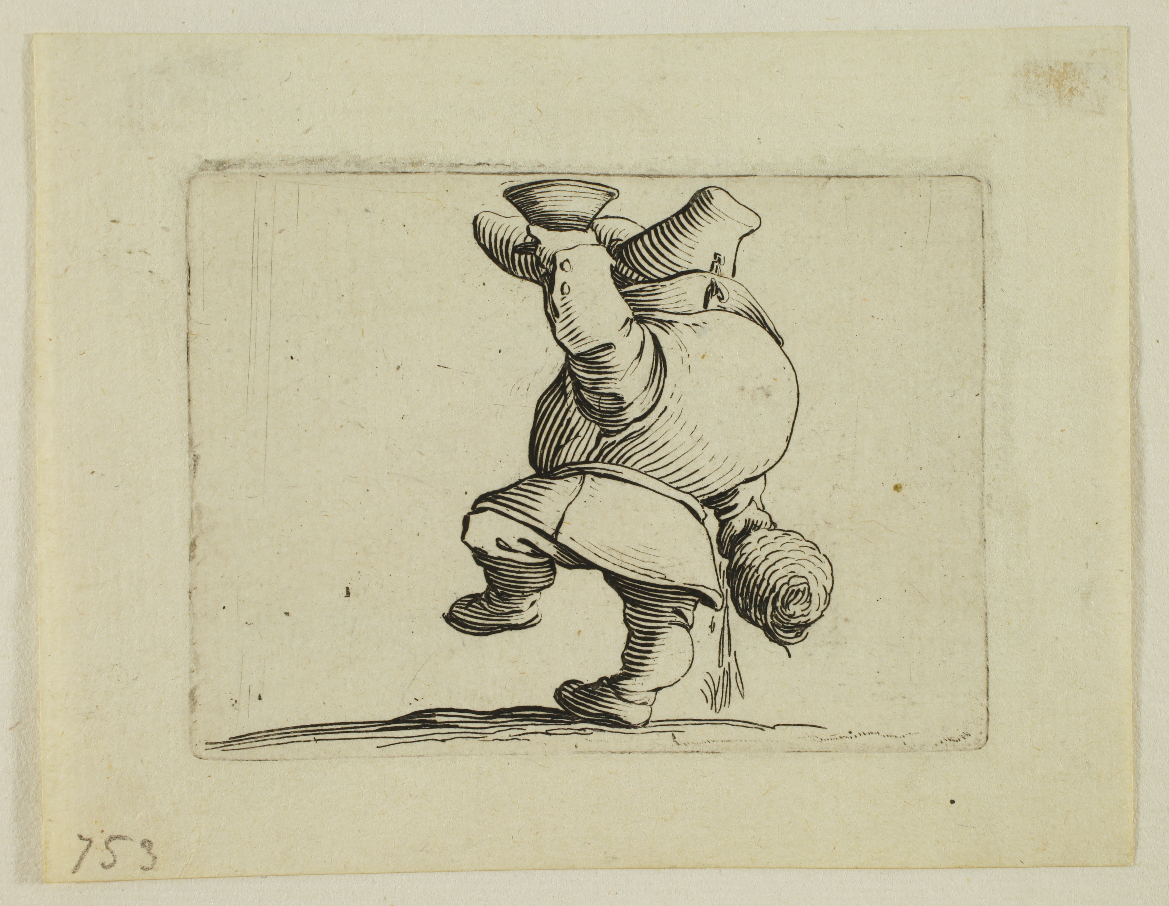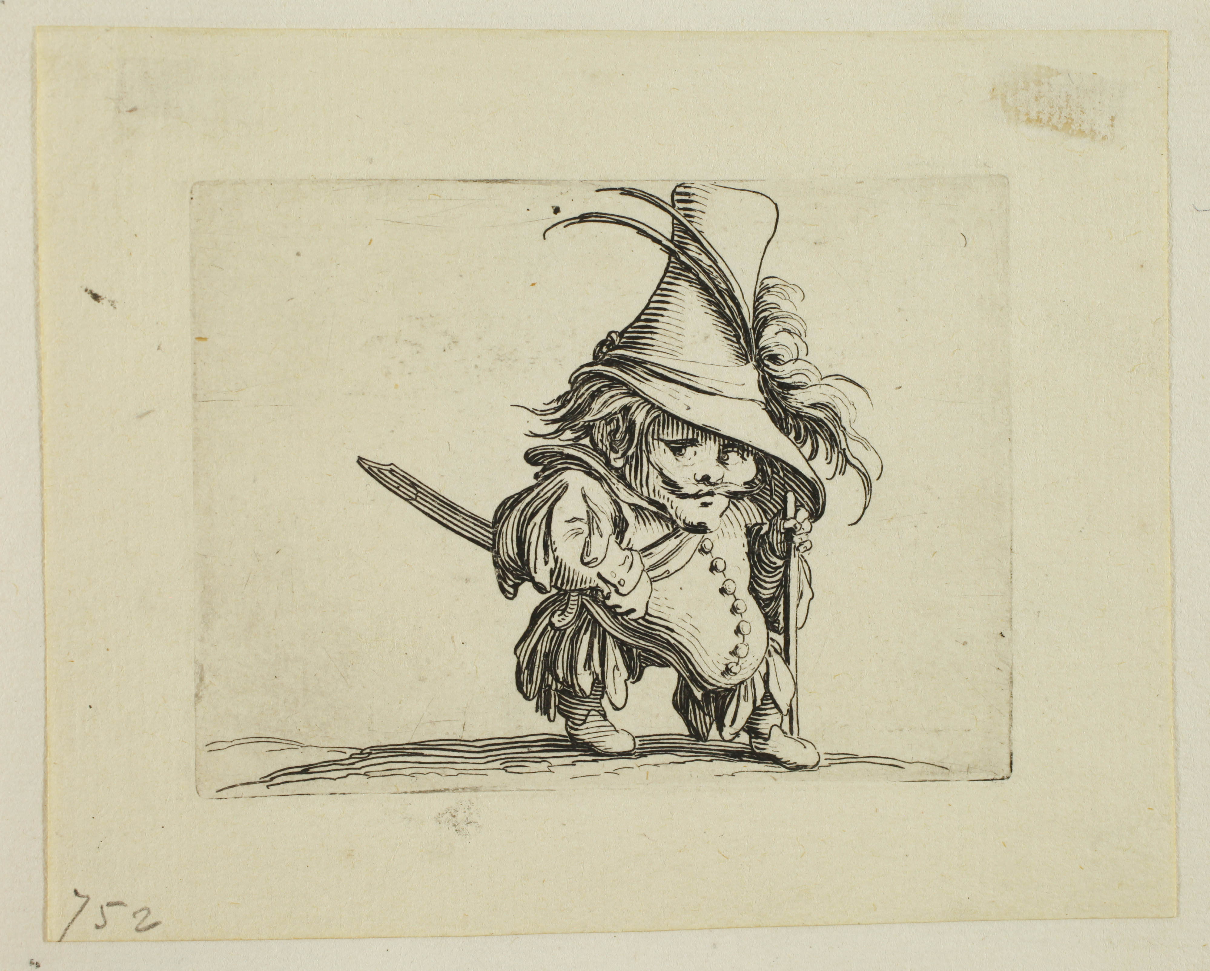 Frontispice : Lieure 279, 1er état/2 avant l’adresse d’Israël Silvestre ; L’Homme s’apprêtant à tirer son sabre : L. 407, état unique ; L’Estropié au capuchon : L. 408, 1er état/2 avant la numérotation ; Le Bossu à la canne : L. 409, 1er état/2 avant la numérotation ; L’Estropié à la béquille et à la jambe de bois : L. 410, 1er état/2 avant la numérotation ; Le Buveur vu de face : L. 411 , 1er état/2 avant la numérotation ; Le Buveur vu de dos : L. 412, 1er état/3 avant que le terrain à gauche soit effacé sur un espace d’un centimètre et avant la numérotation ; Le Duelliste aux deux sabres : L. 413, 1er état/2 avant la numérotation ; Le Duelliste à l’épée et au poignard : L. 414 , 1er état/2 avant la numérotation ; L’Homme au gros ventre orné d’une rangée de boutons : L. 415, 1er état/2 avant la numérotation ; L’Homme au gros dos orné d’une rangée de boutons : L. 416, 1er état/2 avant la numérotation ; L’Homme au ventre tombant et au chapeau très élevé : L. 417, 1er état/2 avant la numérotation ; Le Joueur de violon : L. 418 , 1er état/2 avant la numérotation ; L’Homme masqué aux jambes torses : L. 419, 1er état/2 avant la numérotation ; Le Joueur de luth : L. 420, 1er état/2 avant la numérotation ; Le Joueur de vielle : L. 421, 1er état/2 avant la numérotation ; Le Joueur de flageolet : L. 422, 1er état/2 avant la numérotation ; L’Homme raclant un gril en guise de violon : L. 423 , 1er état/2 avant la numérotation ; Le Joueur de cornemuse : L. 424, 1er état/2 avant la numérotation ; Le Comédien masqué jouant de la guitare : L. 425, 1er état/2 avant la numérotation ; Le Bancal jouant de la guitare : L. 426, 1er état/2 avant la numérotation.