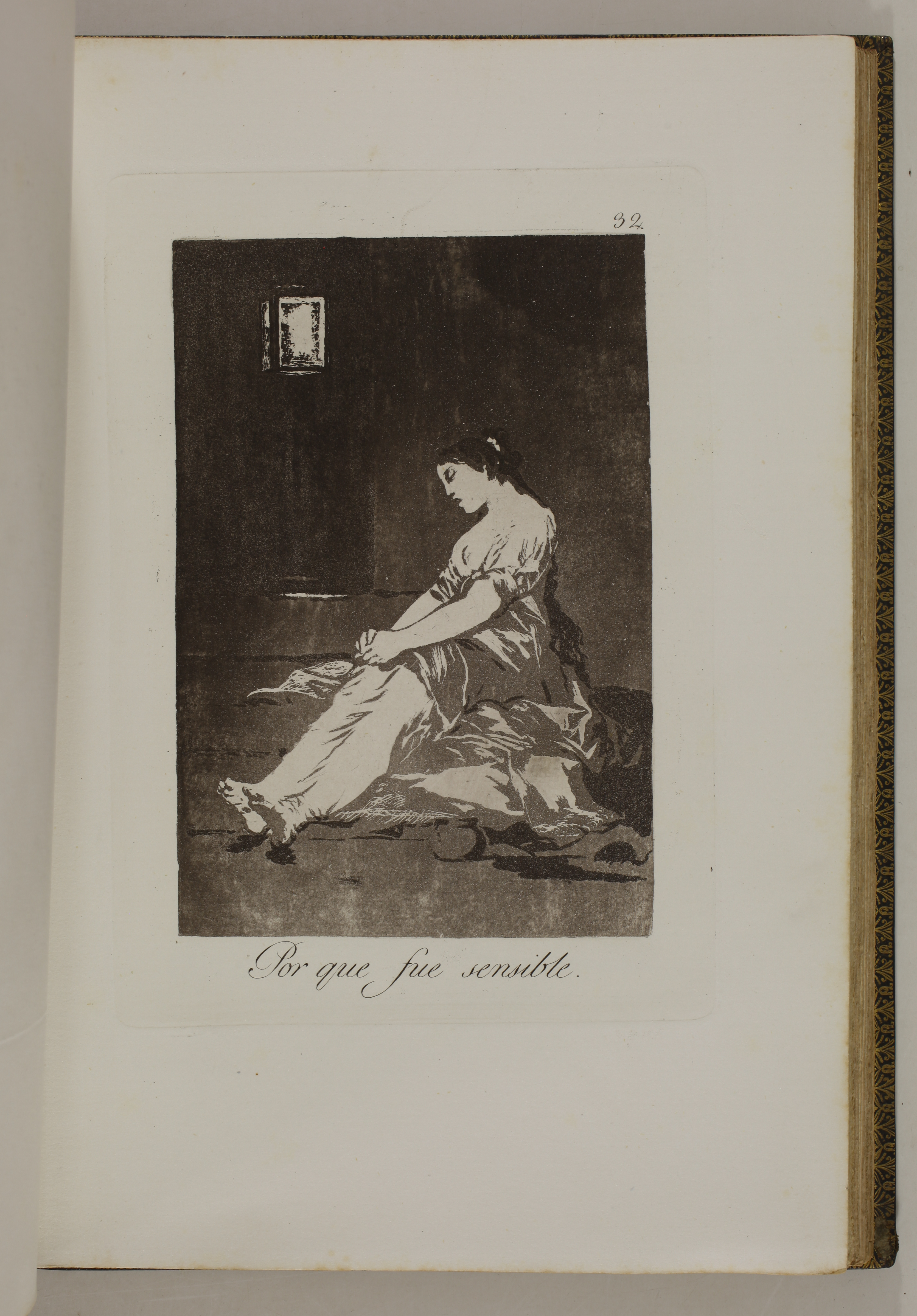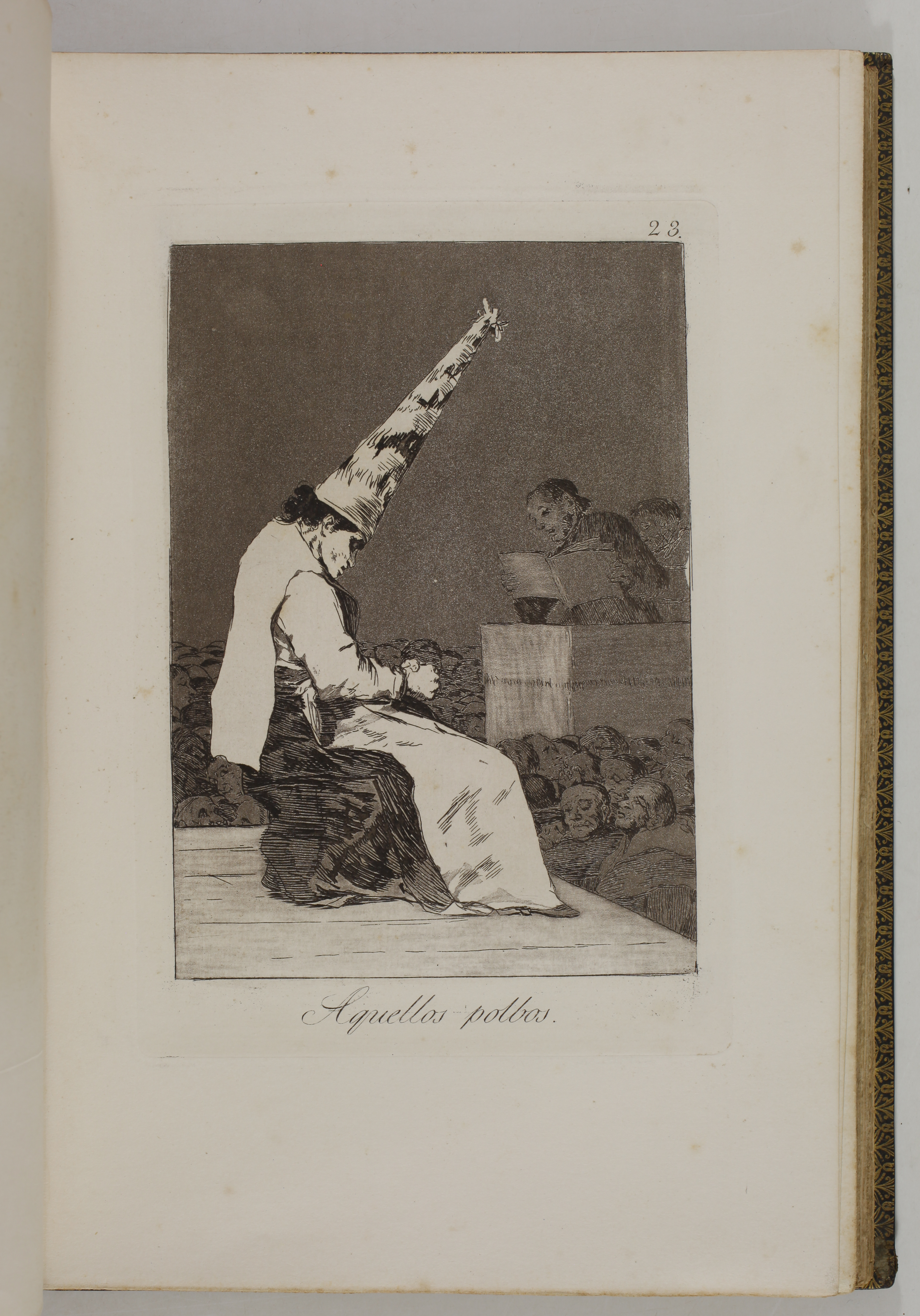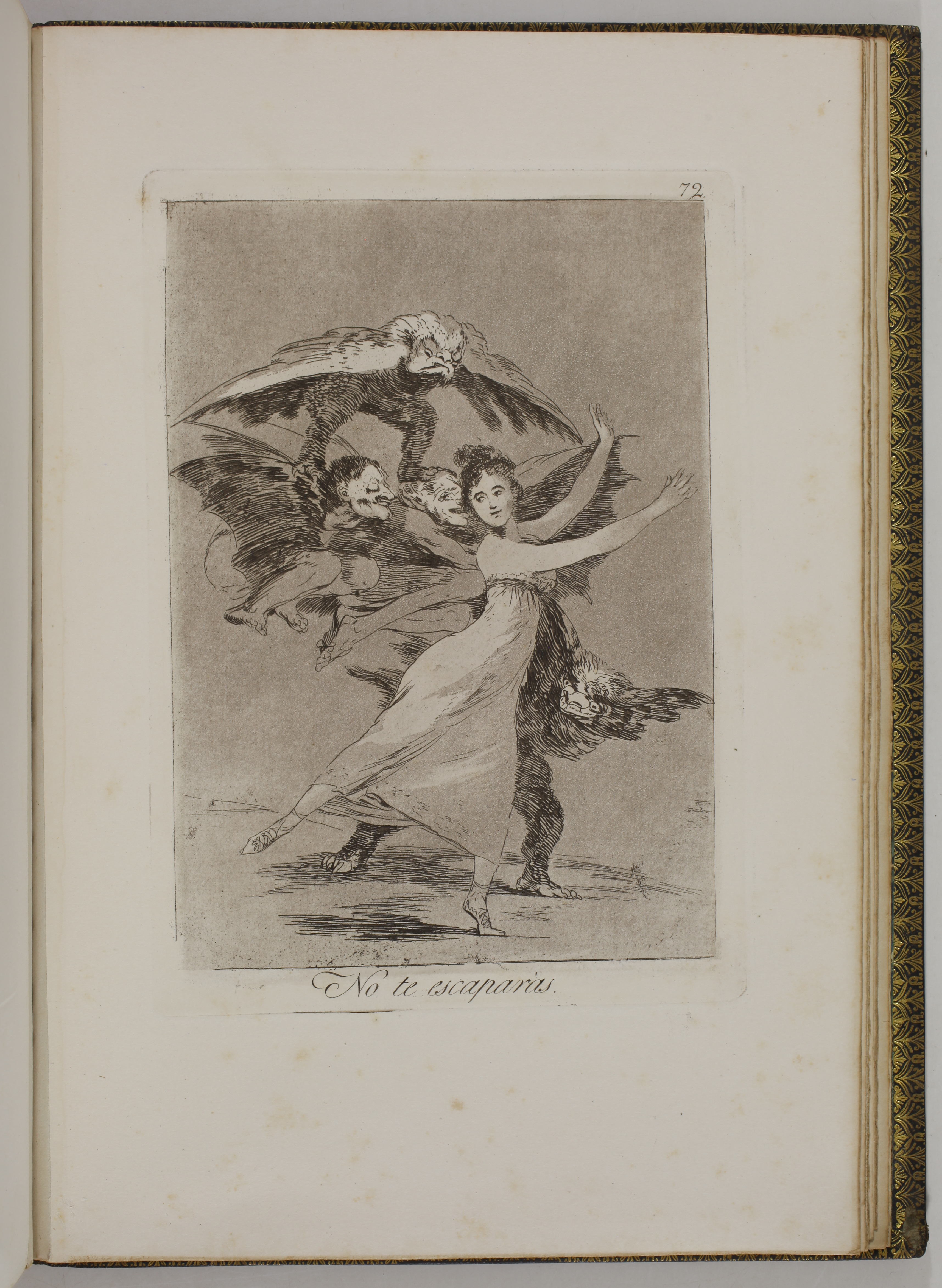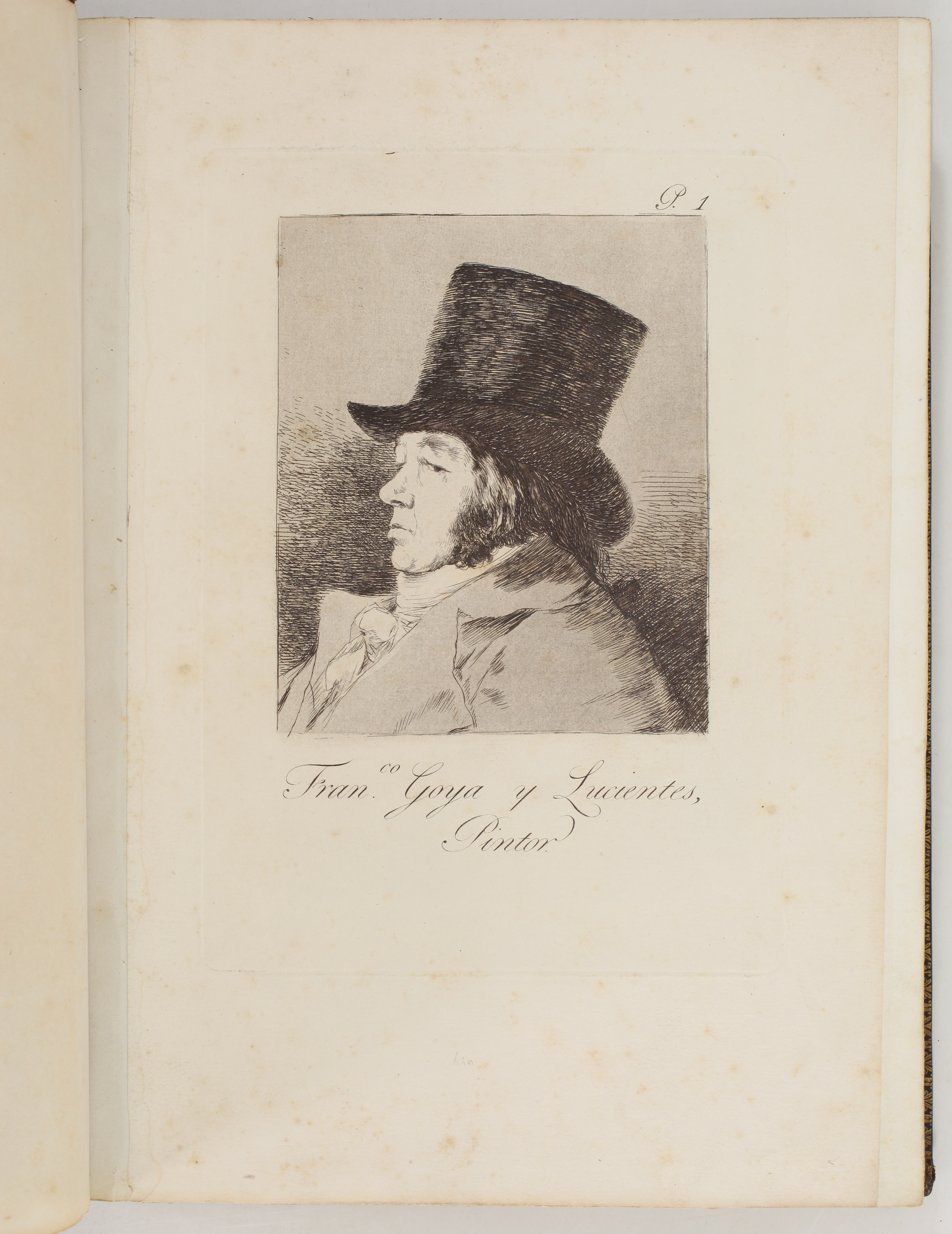 The impressions correspond to the second edition of the Caprices, as described by Tomás Harris in his catalogue raisonné of Goya's prints. According to Harris's analysis of the earlier impressions of this edition, most of the impressions of our volume belong to the first printing of the second edition. The main indication is the absence of bevelled edges on the plate of Goya's self-portrait, plate 1 of the series. Harris indicates that these bevels were made at the top and bottom of the plate during the printing of the second edition.