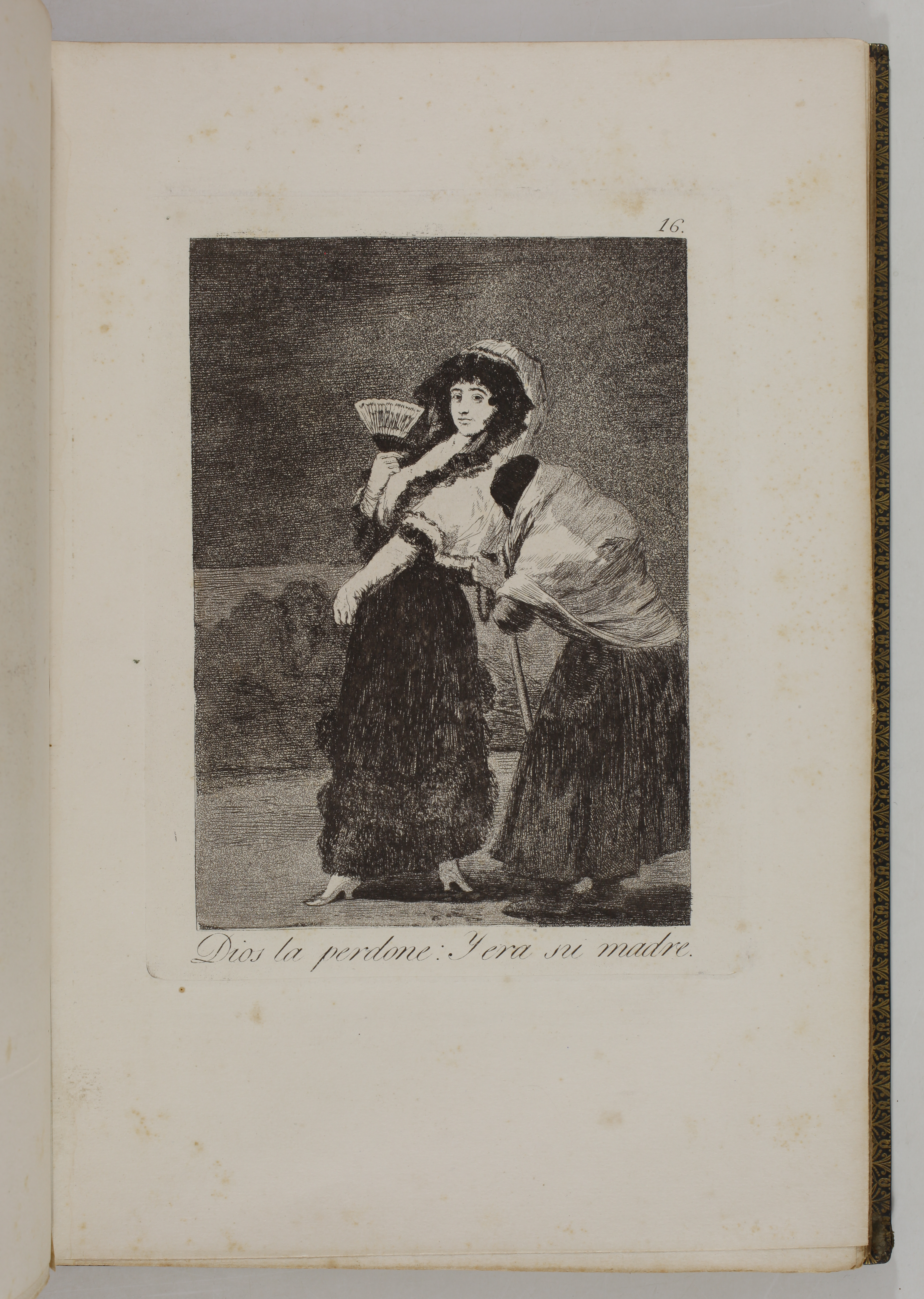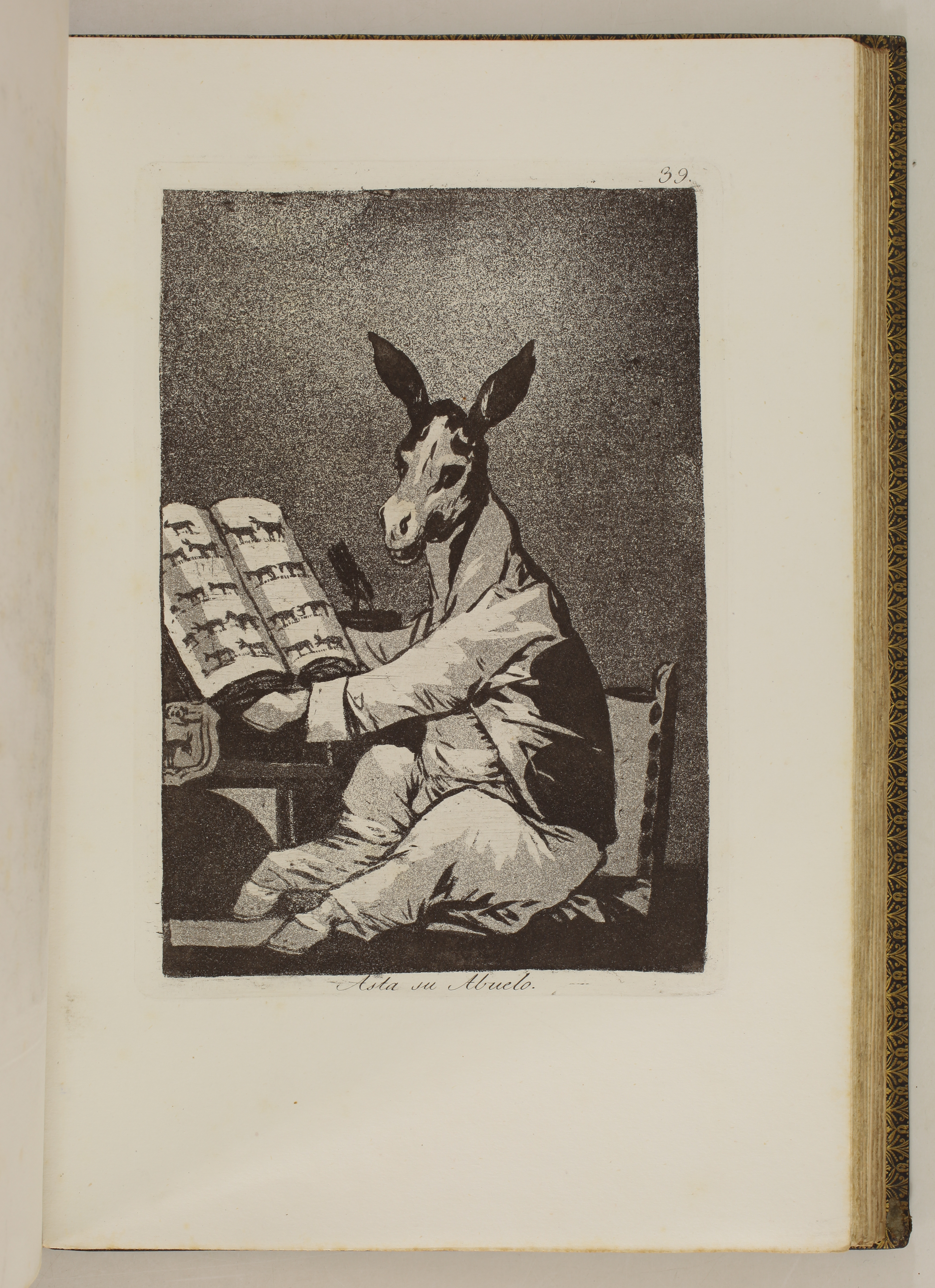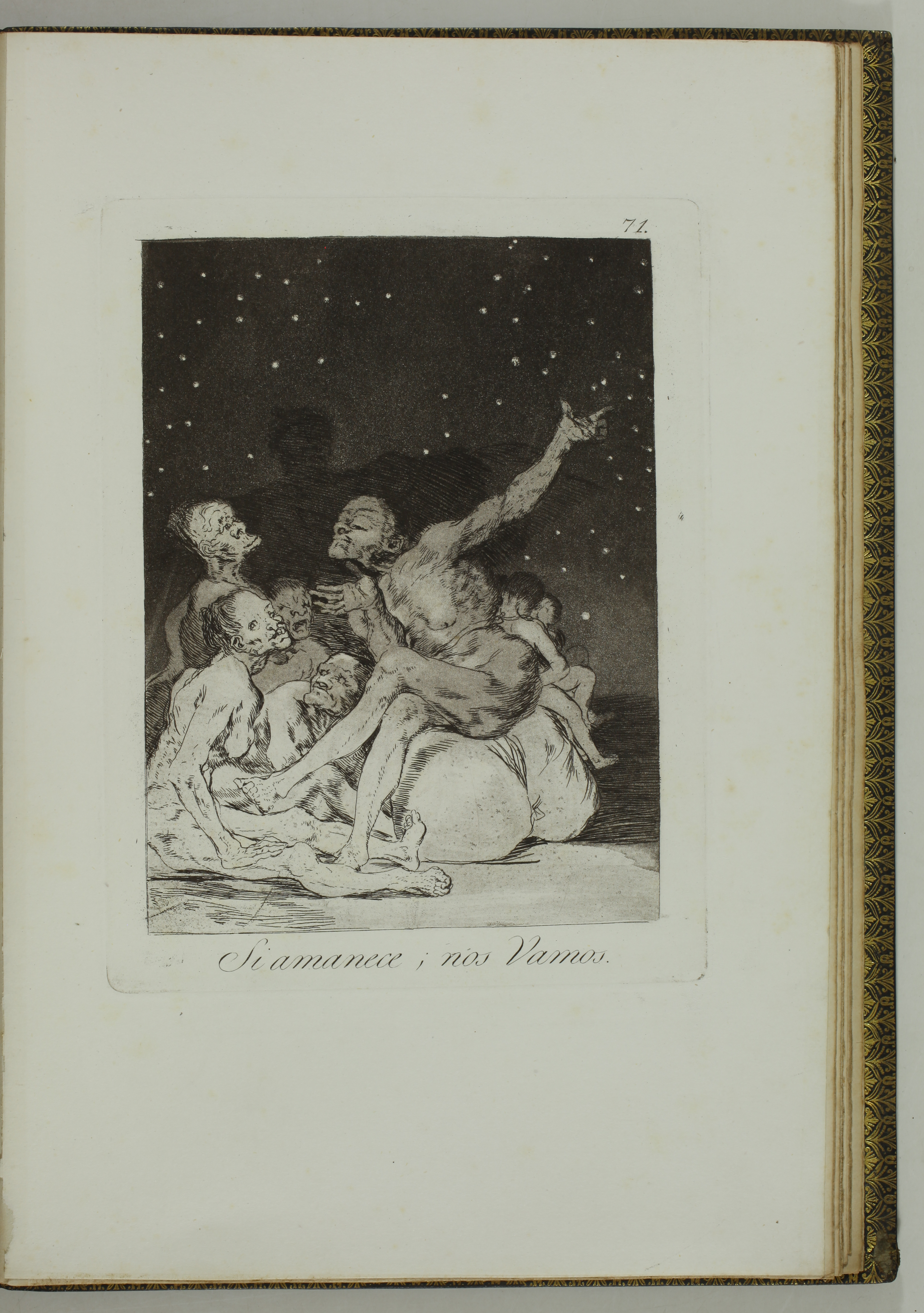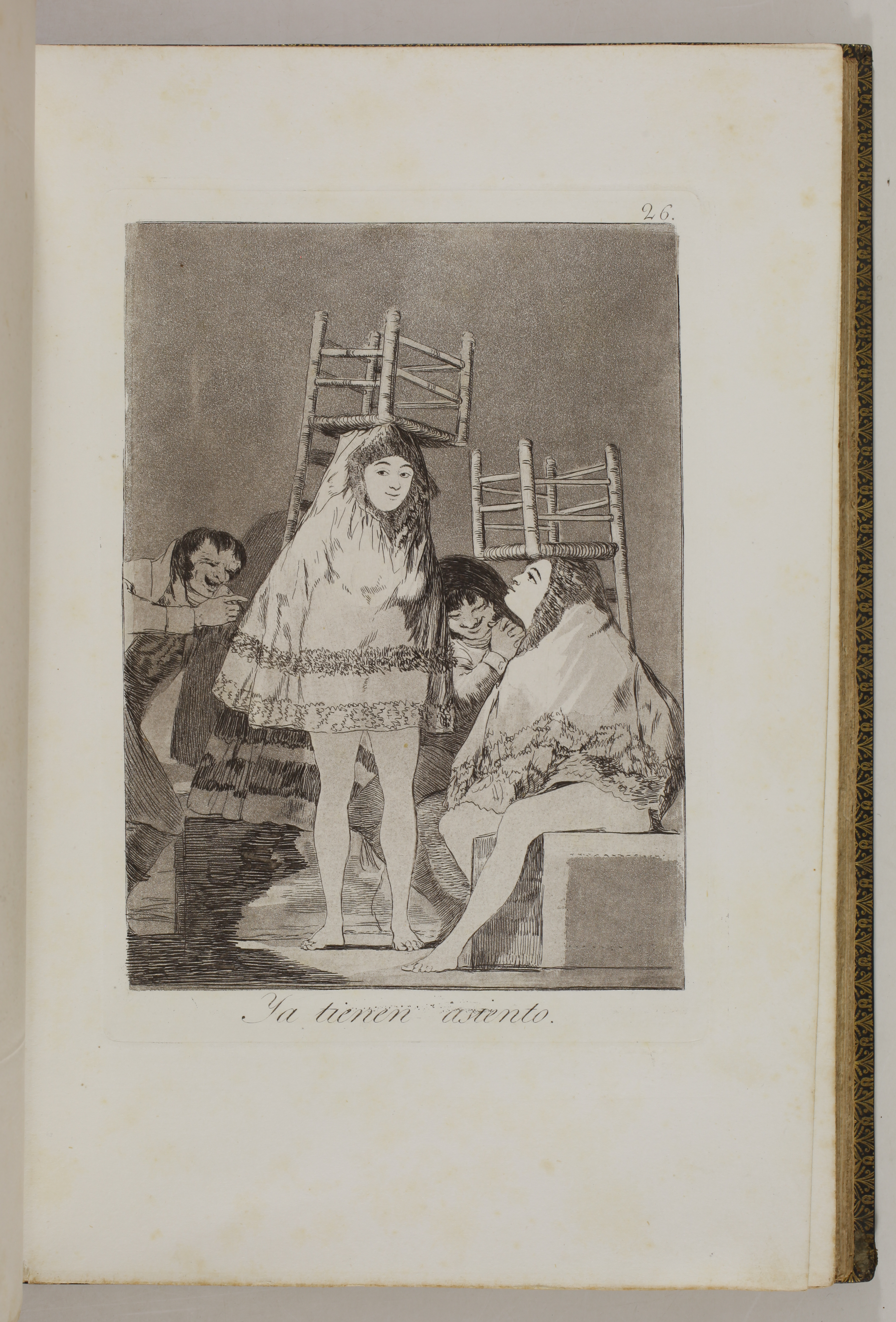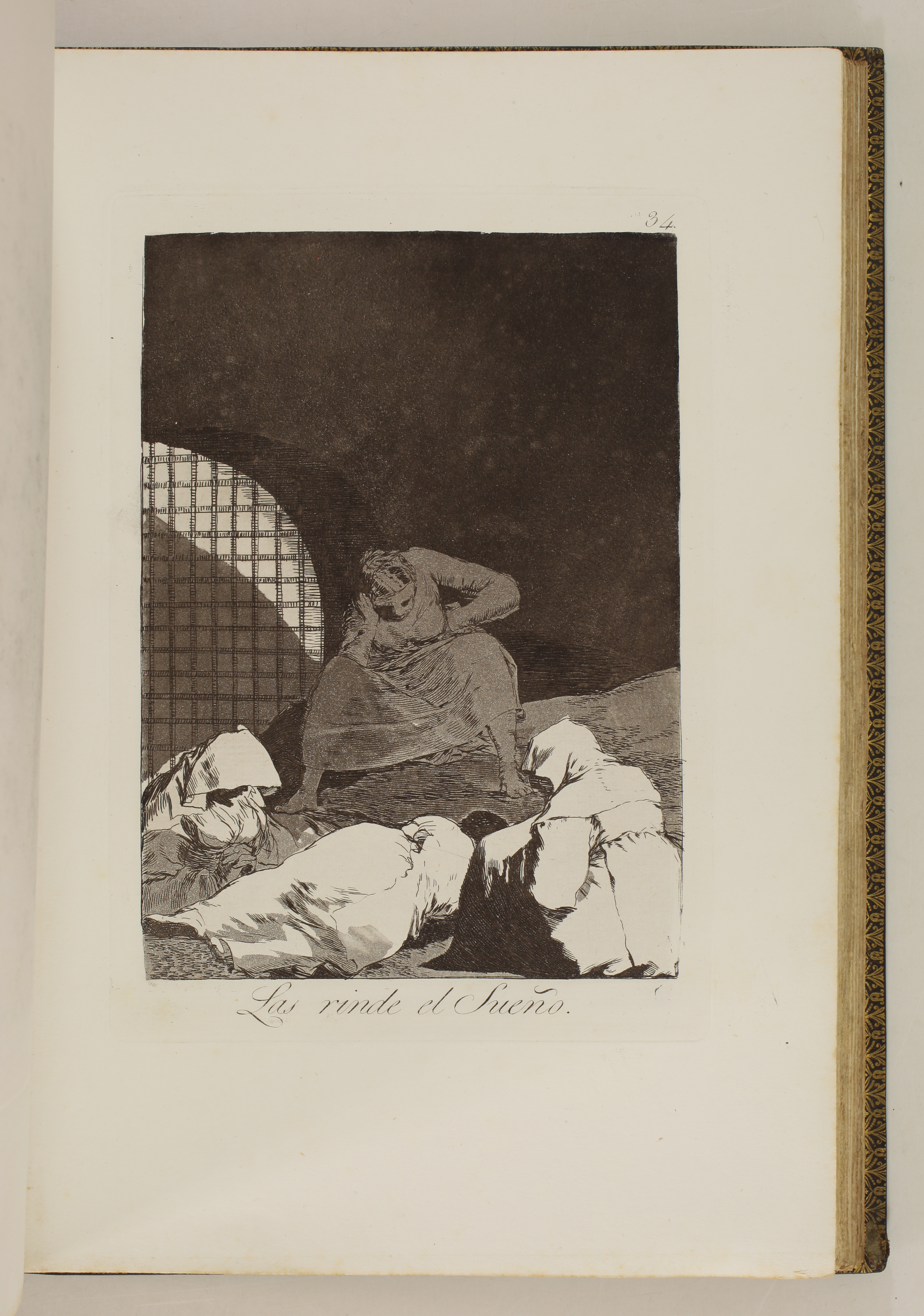 The impressions correspond to the second edition of the Caprices, as described by Tomás Harris in his catalogue raisonné of Goya's prints. According to Harris's analysis of the earlier impressions of this edition, most of the impressions of our volume belong to the first printing of the second edition. The main indication is the absence of bevelled edges on the plate of Goya's self-portrait, plate 1 of the series. Harris indicates that these bevels were made at the top and bottom of the plate during the printing of the second edition.