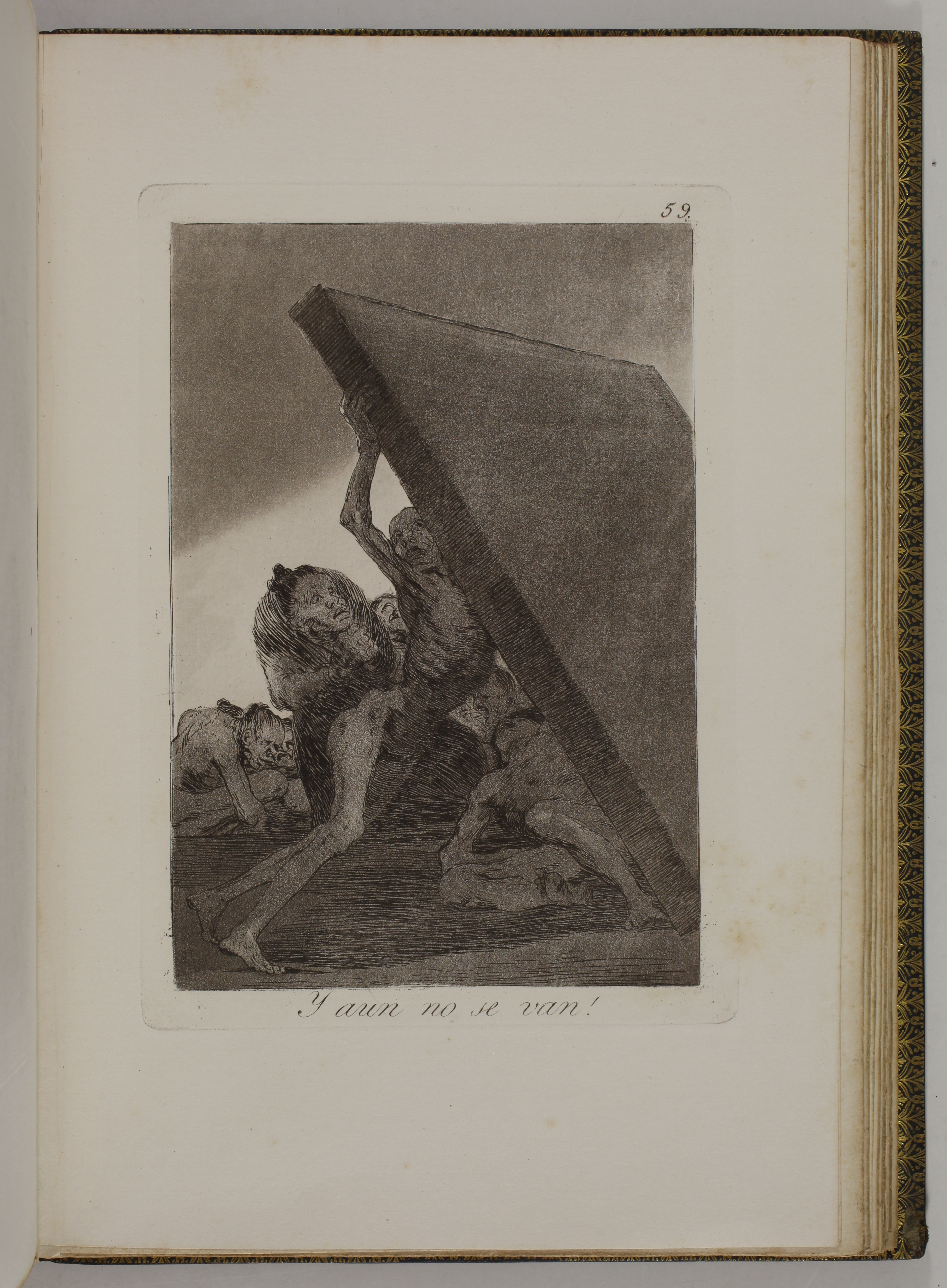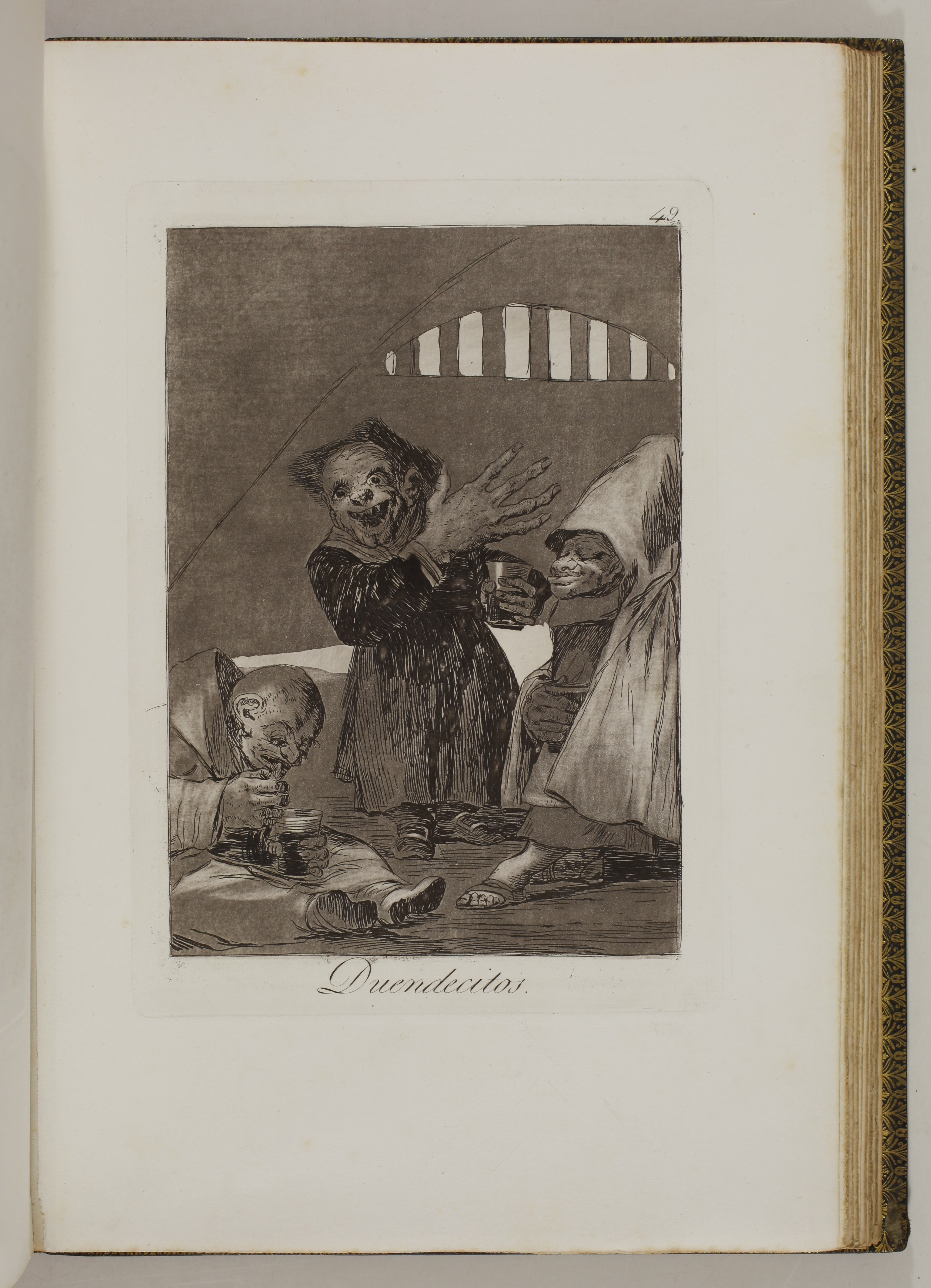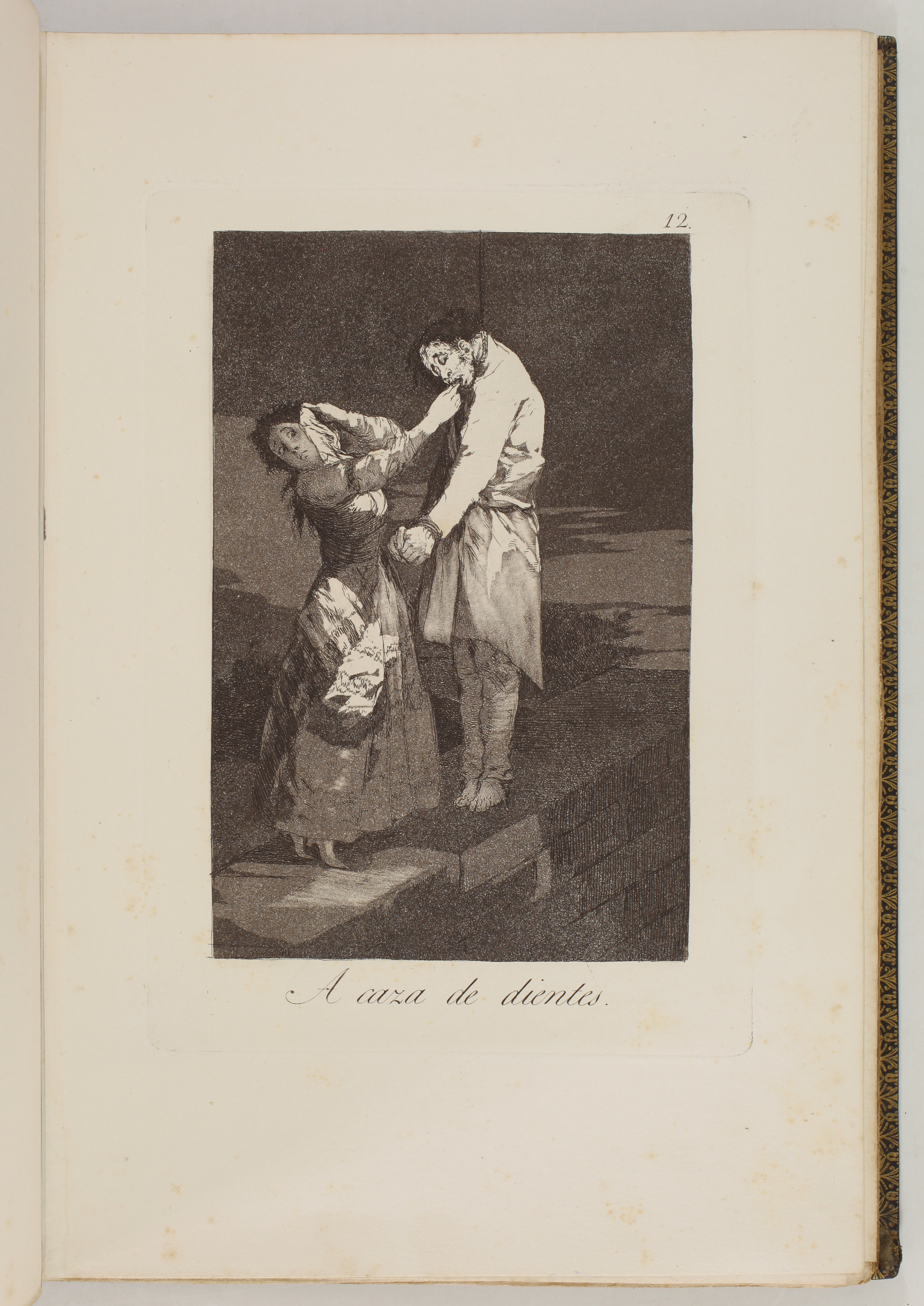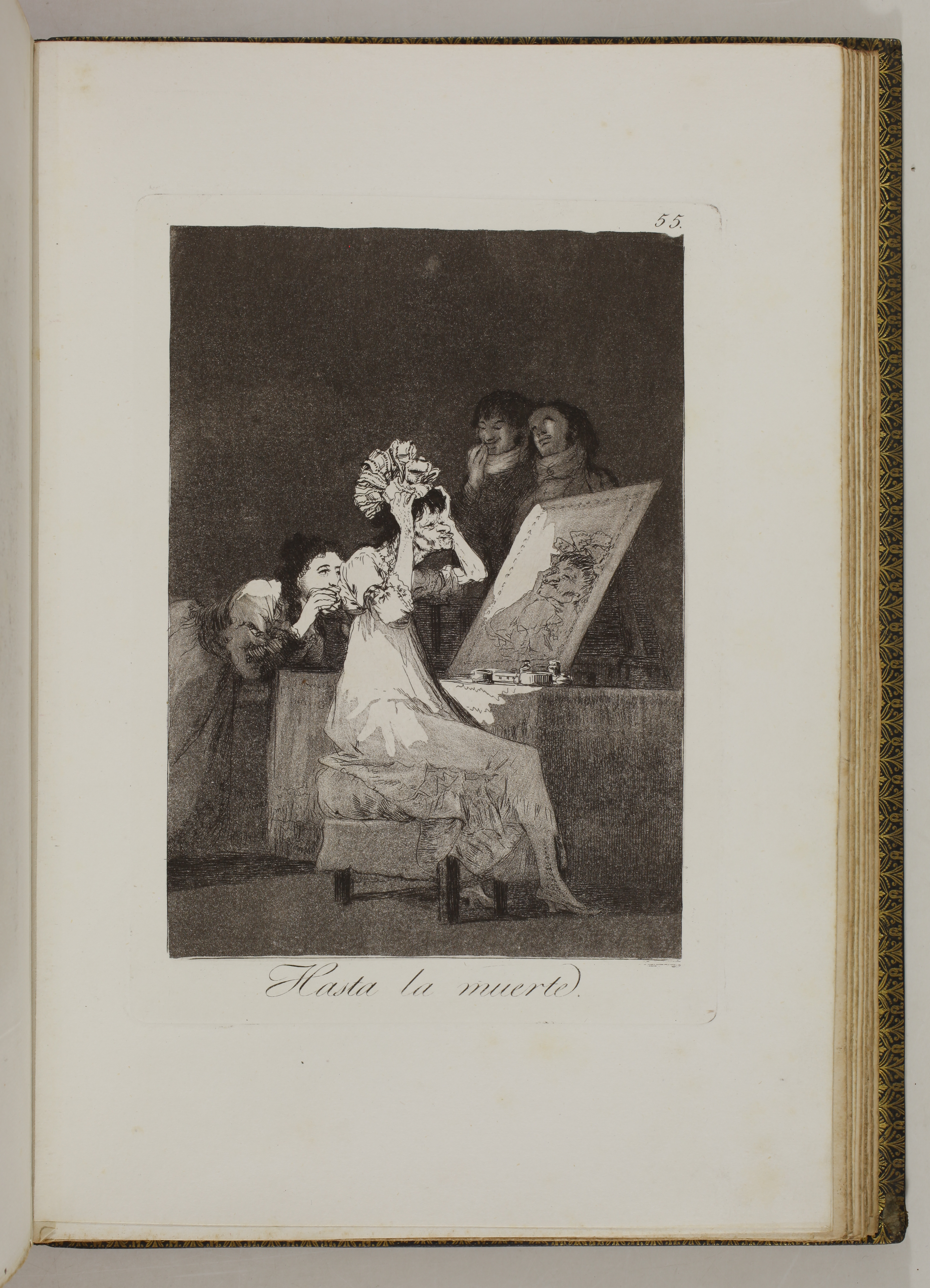 The impressions correspond to the second edition of the Caprices, as described by Tomás Harris in his catalogue raisonné of Goya's prints. According to Harris's analysis of the earlier impressions of this edition, most of the impressions of our volume belong to the first printing of the second edition. The main indication is the absence of bevelled edges on the plate of Goya's self-portrait, plate 1 of the series. Harris indicates that these bevels were made at the top and bottom of the plate during the printing of the second edition.