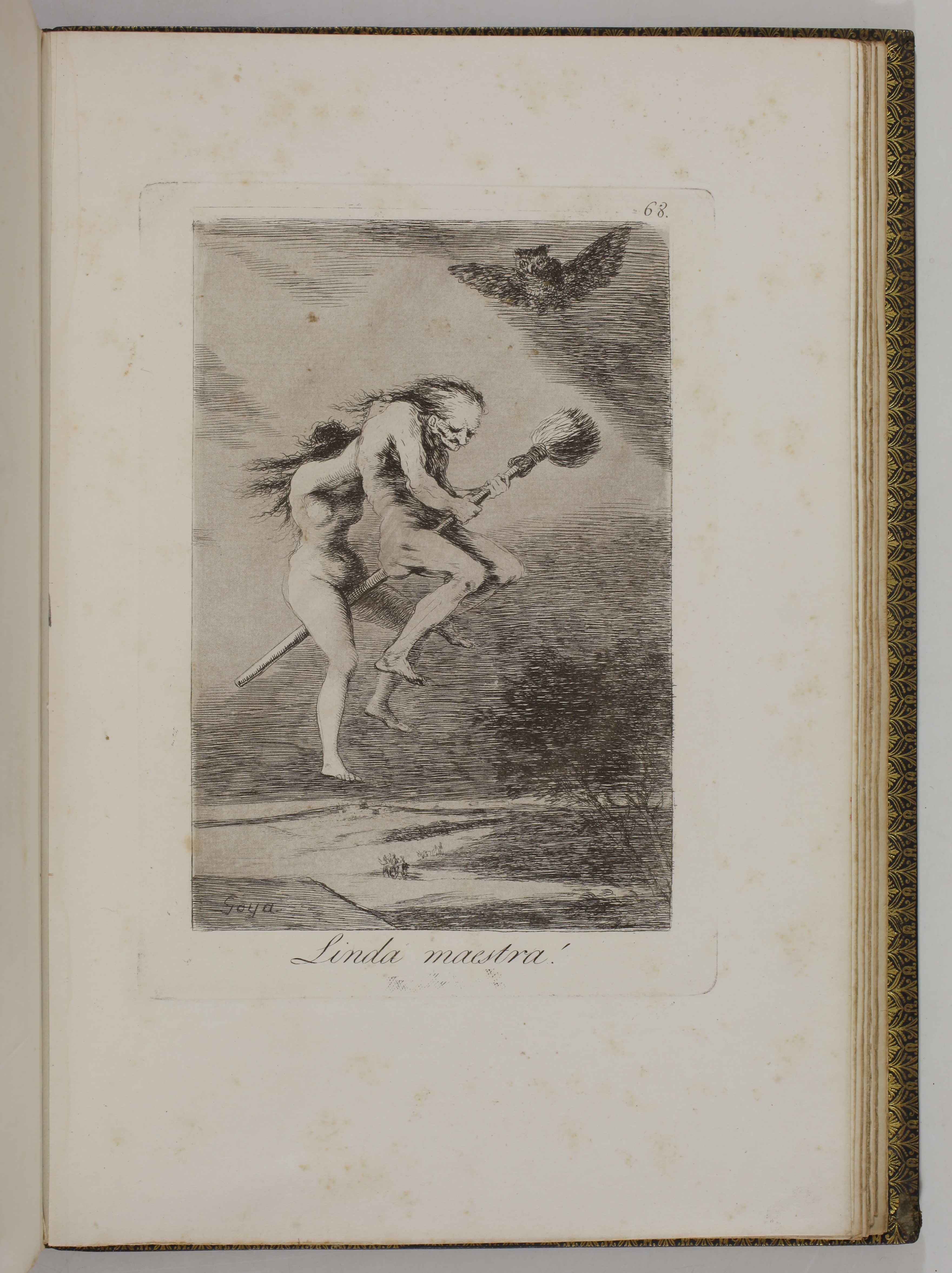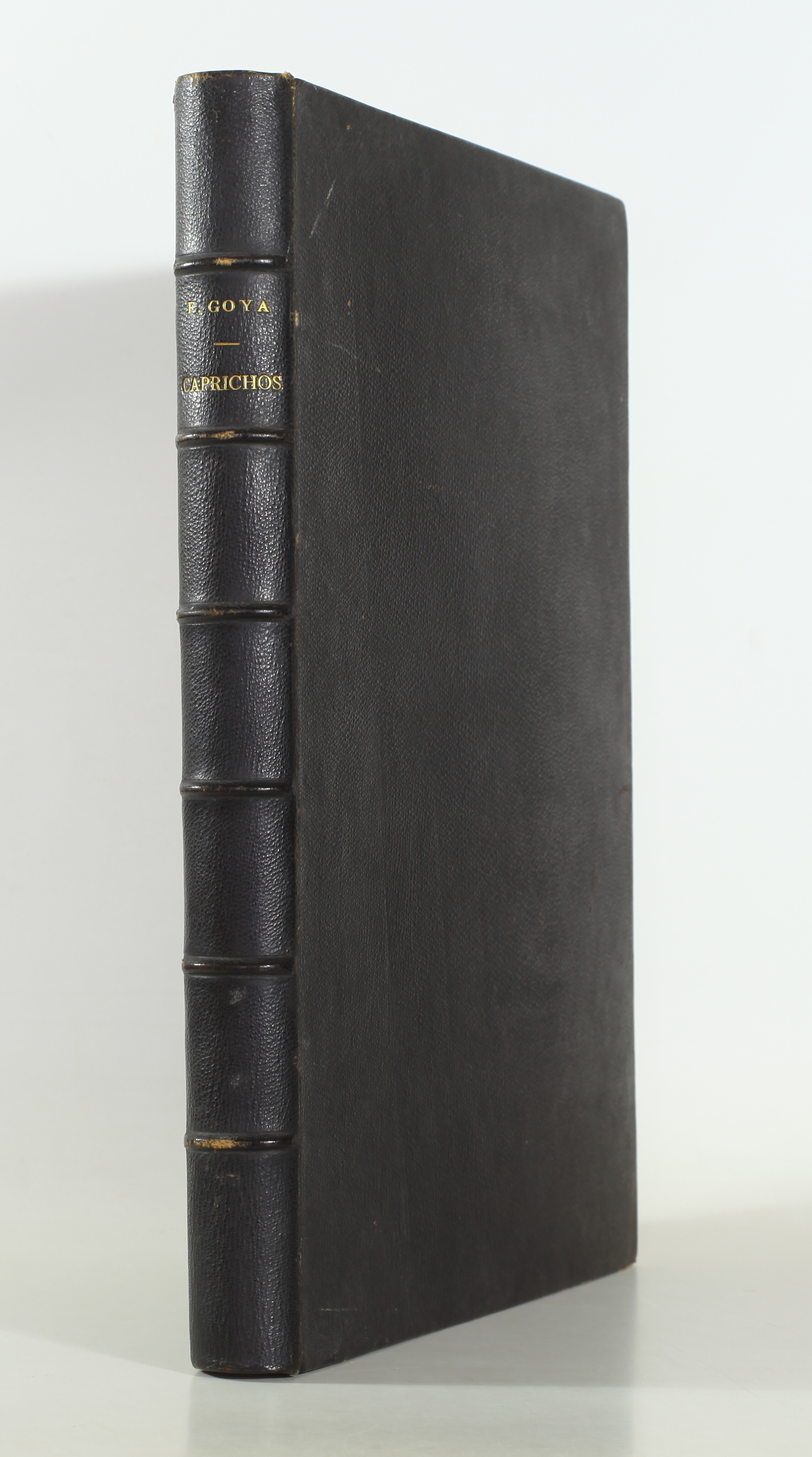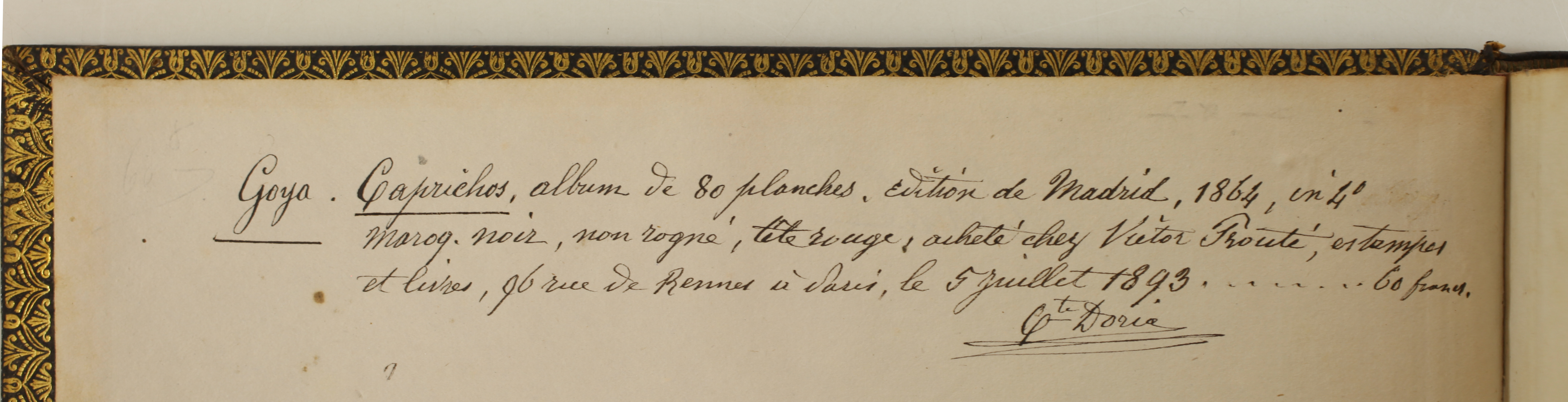 Provenance: Comte Doria, most likely Armand-François-Paul des Friches Doria (1824-1896), French politician, patron of the arts, and art collector. Purchased by him from Victor Prouté, founder of the Prouté gallery, bookseller and print dealer, located at 96 rue de Rennes between 1883 and 1895, before moving to rue de Seine. Inscription on the reverse of the first blank page: Goya. Caprichos, album de 80 planches, édition de Madrid, 1864, in 4° maroq. noir, non rogné, tête rouge, acheté chez Victor Prouté, estampes et livres, 96 rue de Rennes à Paris, le 5 juillet 1893 ..... 60 francs. Cte Doria. [Goya. Caprichos, album of 80 plates, Madrid edition, 1864, in 4° black morocco, untrimmed, red head, purchased from Victor Prouté, prints and books, 96 rue de Rennes in Paris, on 5 July 1893 ..... 60 francs. Comte Doria].
