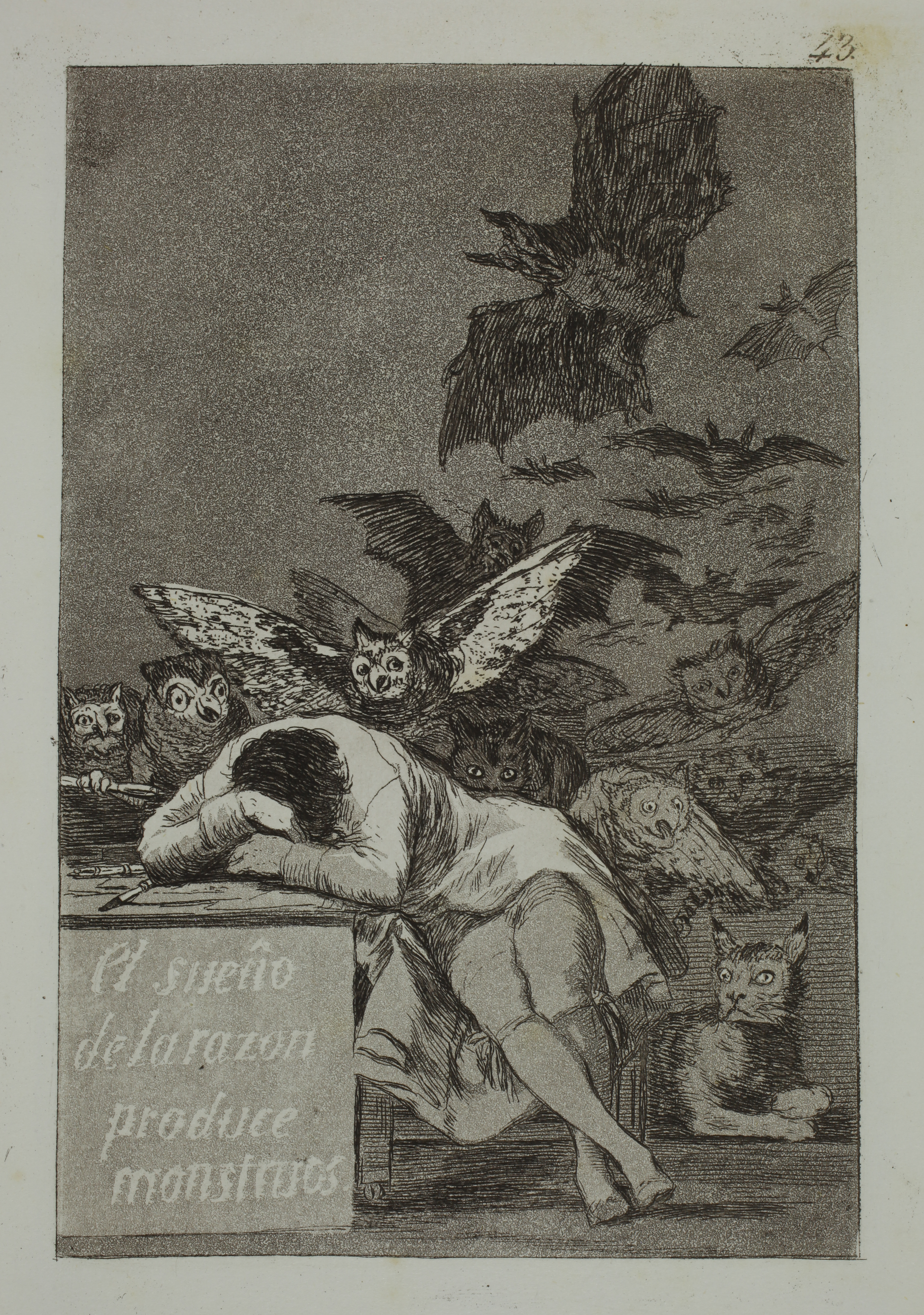 The second clue is obviously the quality of the impressions. Goya's self-portrait is still very beautiful, the blacks on the hat are well preserved and the contrasts are intact. The famous plate The Sleep of Reason Produces Monsters is particularly beautiful, with the title still perfectly legible.